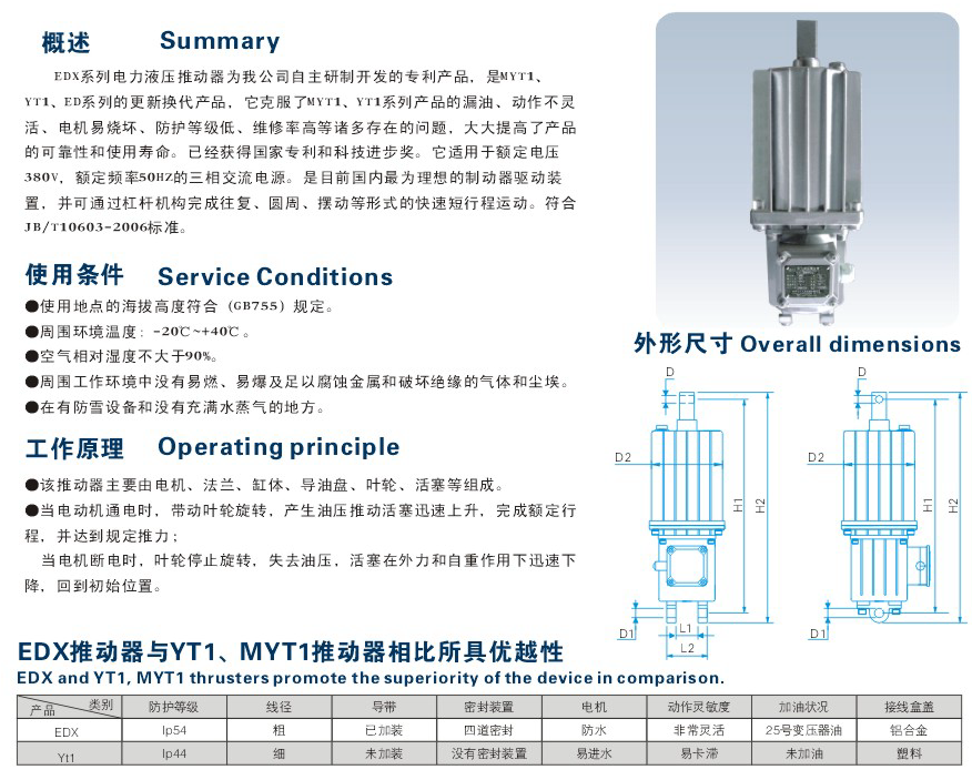 EDX系列電力電壓推動(dòng)器為我公司自主研制開(kāi)發(fā)的專利產(chǎn)品,是MYT1、YT1、ED系列的更新?lián)Q代產(chǎn)品,他克服了MYT1、YT1系列產(chǎn)品的漏油,動(dòng)作不靈活、電機(jī)易燒壞,防護(hù)等級(jí)低、維修率高等諸多存在的問(wèn)題,大大提高了產(chǎn)品的可靠性和使用壽命。已經(jīng)獲得國(guó)家專利和科技進(jìn)步獎(jiǎng)。它適用于額定電壓380V,額定頻率50HZ的三相交流電源,是目前國(guó)內(nèi)理想的制動(dòng)器驅(qū)動(dòng)裝置,并可通過(guò)杠桿機(jī)構(gòu)完成往復(fù)、圓周、擺動(dòng)等形式的快速短行程運(yùn)動(dòng),符合JB-/T10603-2006標(biāo)準(zhǔn)。